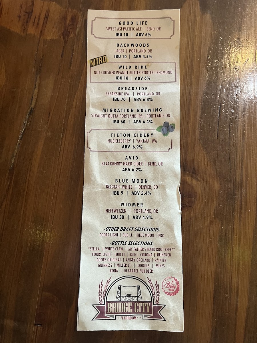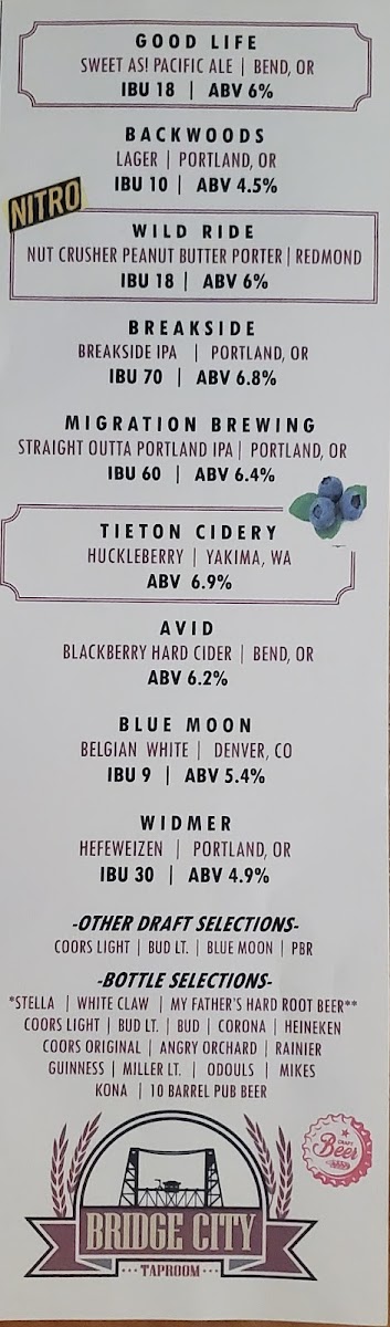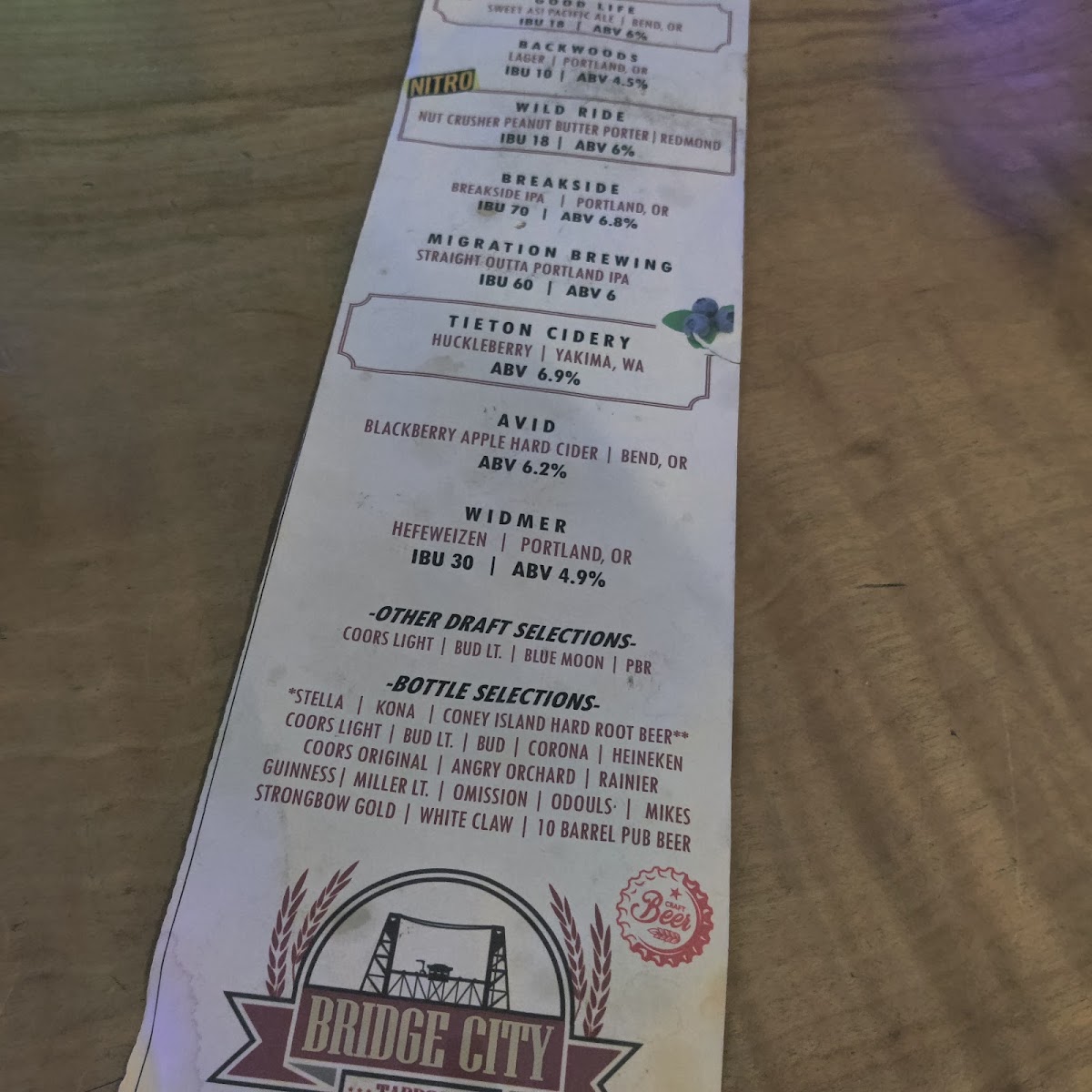 Welcome to Bridge City Taproom, a delightful culinary gem nestled in Portland, Oregon. Located at 620 SE 122nd Ave, this establishment combines a vibrant atmosphere with an impressive menu that caters to all tastes. The menu features enticing bottle selections, including popular options like White Claw and Heineken, perfect for pairing with your meal.